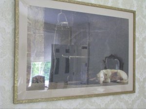 Look for a possible ghostly image in the reflection of the mirror in the picture (right above the dog). Looks like a man reclining and turning his head. I later figured out it was just the reflection of the lamp in the room.