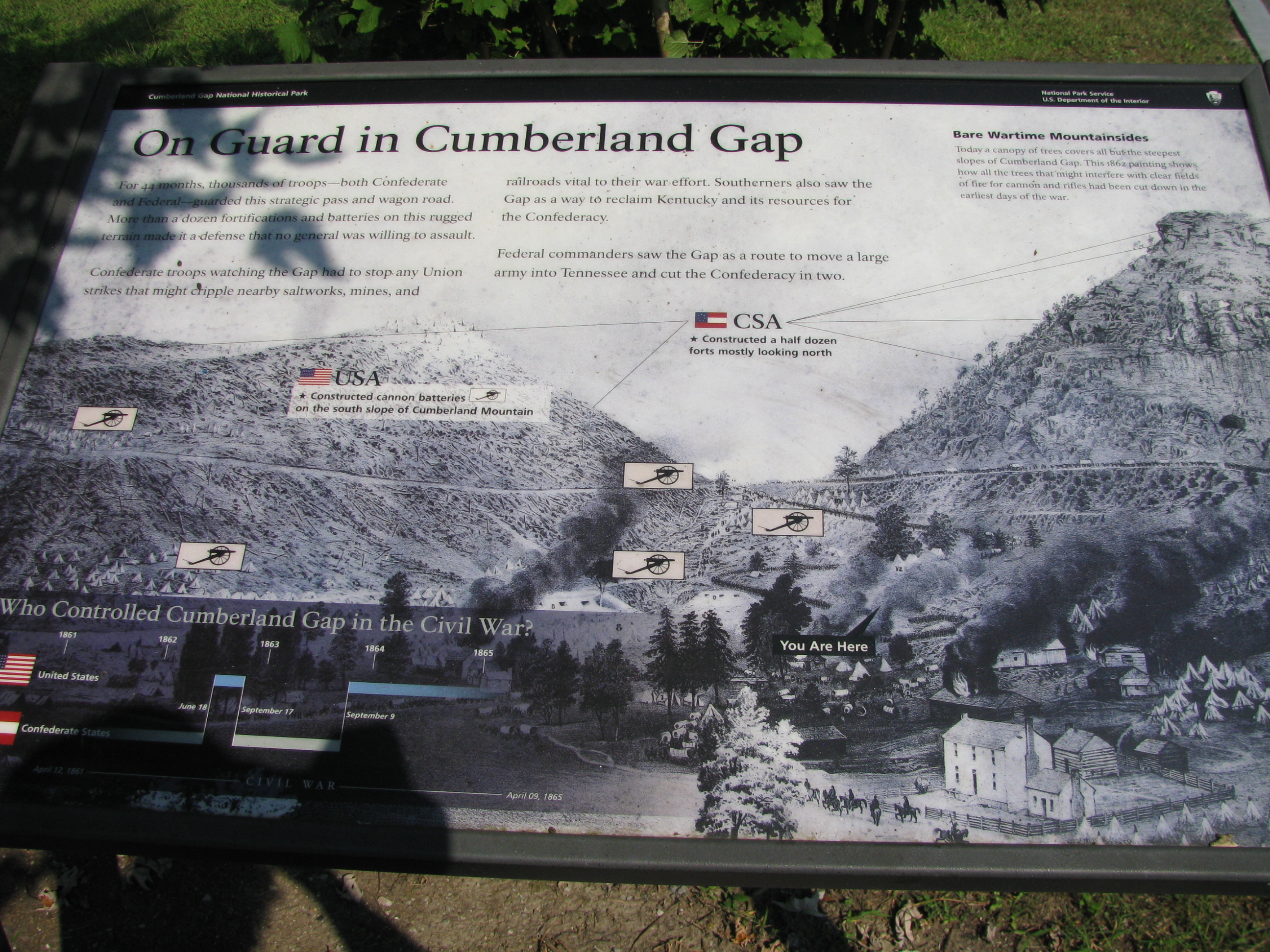 I’m welcomed to Cumberland Gap, Tennessee (state #32 for me! YAY!) before immediately turning back into Virginia on State Road 872 just to get into the main part of town. Now – unless you knew this was the case, you’d figure you were still in Tennessee. However, there is a Cumberland Gap National Historical Park research facility (and parking) on this road, so I imagine these belong in Virginia for some reason or other. My next mission was to drive down Pennlyn Ave. in downtown Cumberland Gap. At the very end is a parking lot – situated, yes, in Virginia territory! This little lot represents the furthest west you can drive a car around in Virginia (so, of course, I had to take a photo of my car parked there – at that moment I was the westernmost vehicle in Virginia – that’s ‘geekspeak’ for cool.)