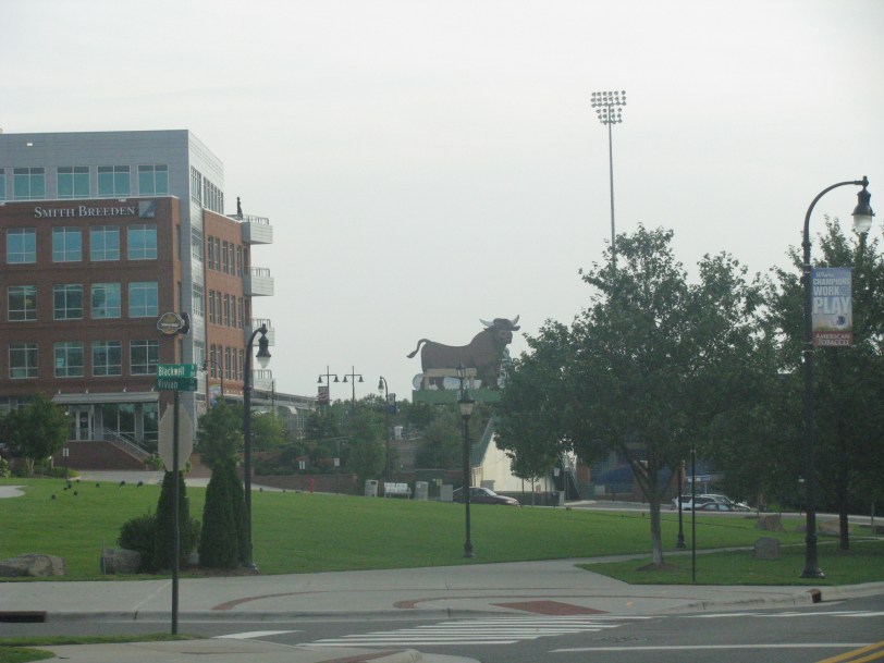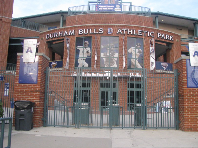 So the second question was how I was going to get a picture. There were a smattering of students walking here and there, but no one around me at the moment. So I decided to set up my camera on 10-second delay and snap a couple of me in front of the Krzyzewskiville and Cameron Indoor signs. I managed to do ok – if not looking like a complete fool running to the sign to pose for my photos. I’m glad no one was too close by. I then took a short drive downtown to take pictures of another closed ballfield, the famed home of the Durham Bulls (of Bull Durham lore).