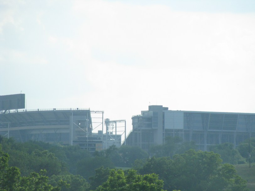 Driving through that Saturday evening we saw Penn State’s mammoth Beaver Stadium perched on a hill – in a way overlooking the rest of the town, yet also quite removed from it, shielded by a barrier of trees. As SI’s Jack McCallum wrote today, the football complex is “a world-unto-itself isolation”. Looking back, just catching a glimpse of the place I could see how one would come to that conclusion. It is a rather otherworldly site – like a spaceship landing in the middle of a field. One might half-expect to hear the theme from Close Encounters of the Third Kind to start blaring from the structure.