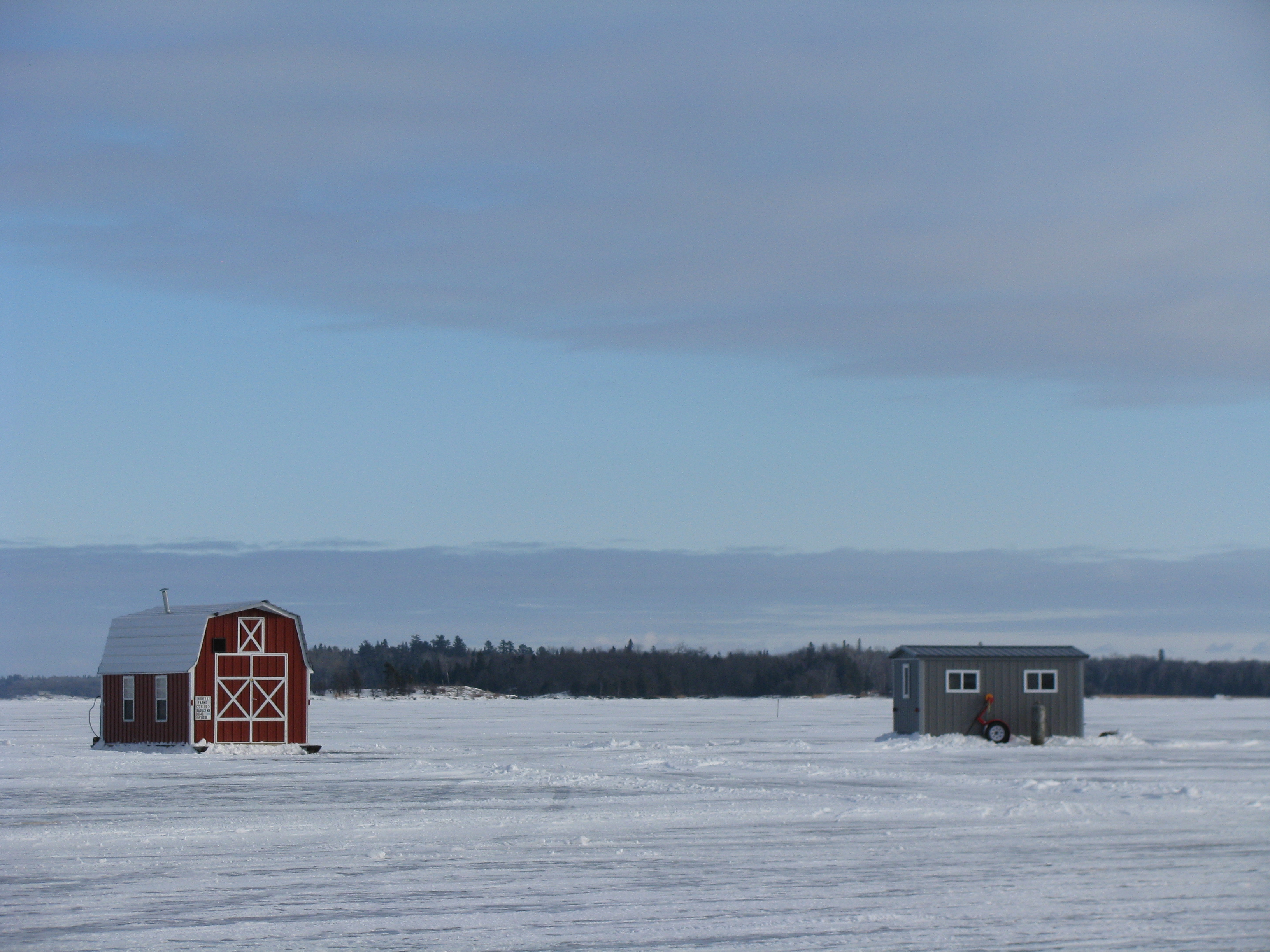 We left Jerry’s and drove onto the ice – my first experience with “ice road trucking.” There were already a few huts set up for ice fishing and various traffic was making its way up and down the ice to set up shop. It’s so weird – almost a feeling of walking on water – to be out walking around the middle of a lake. One could drive on this ice all the way back to Warroad, cutting travel time considerably I suspect. I’m not sure you could do that when we were there – as it was still unseasonably warm and the ice cover in Warroad was suspect.