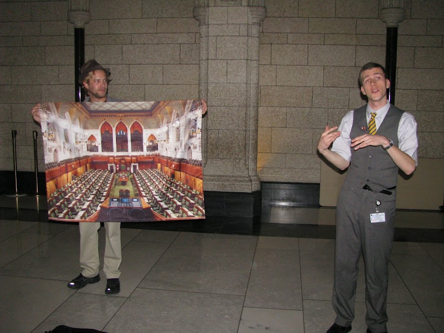 My cousin holding up a poster of the House of Commons while we get some basic background info on it from our guide