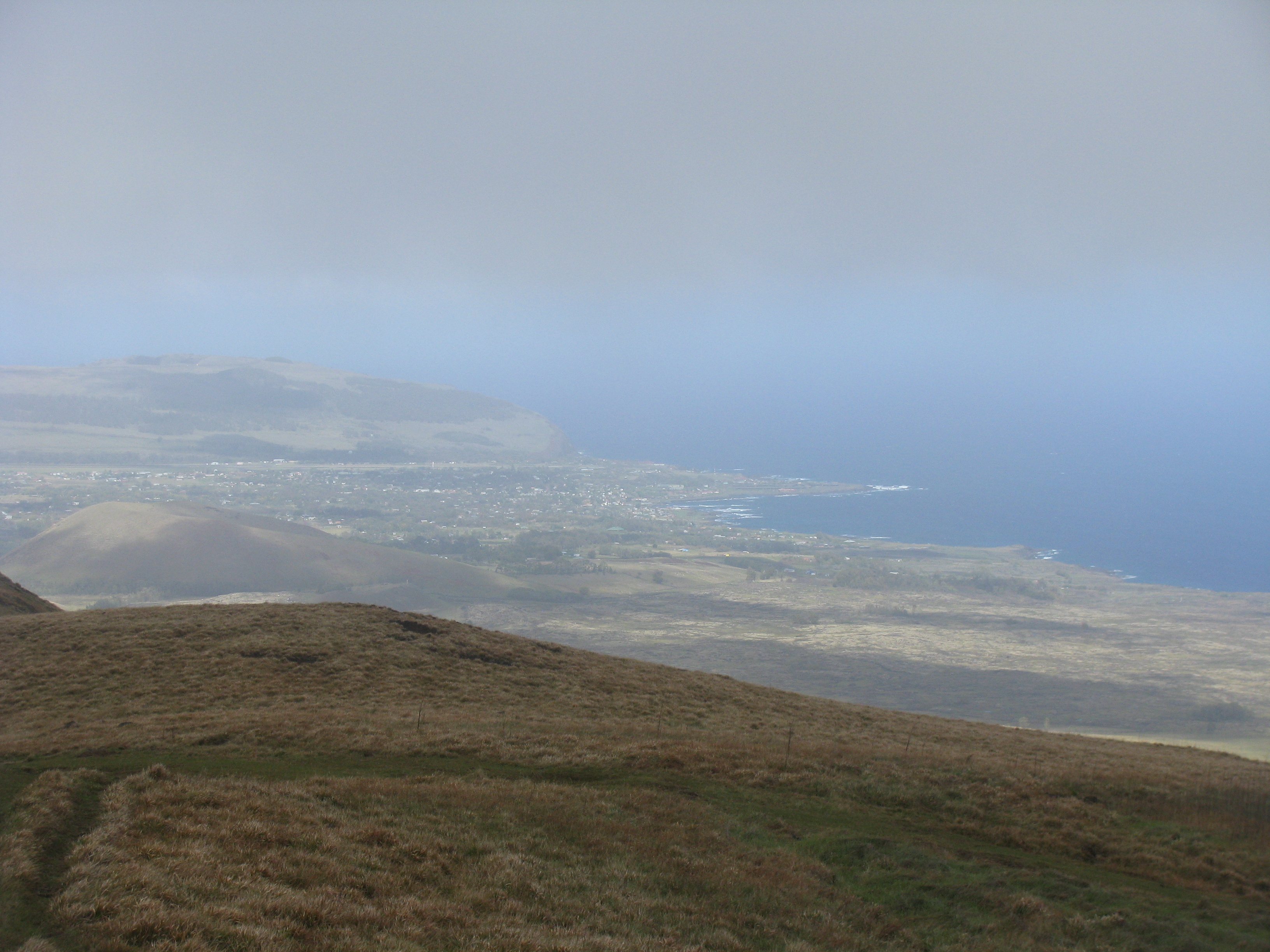 The Rano Raraku site (where the moai were carved) is off in the distance, to the right of the shot. In the far center is Poike, one of the three main volcanoes of the island.