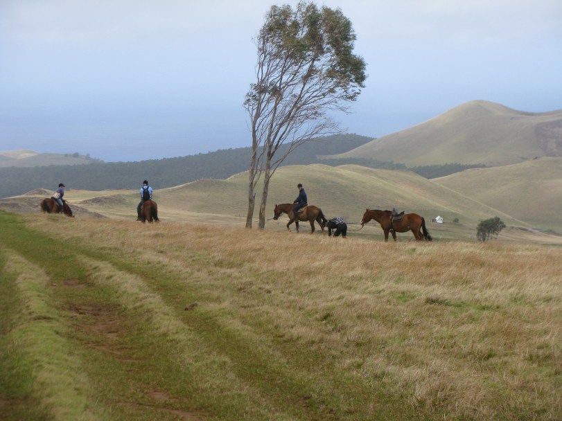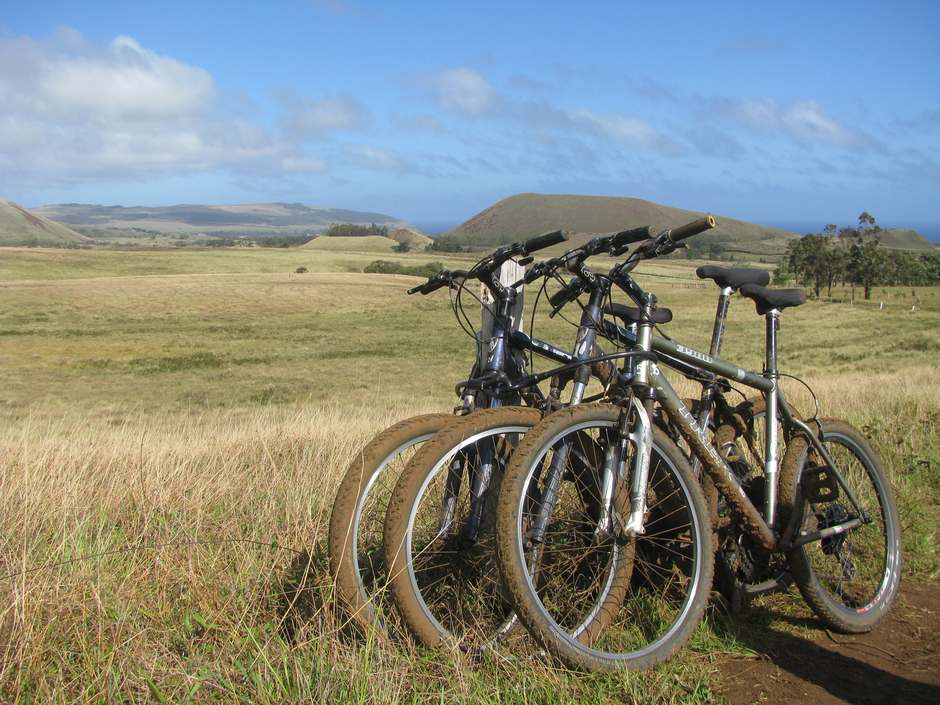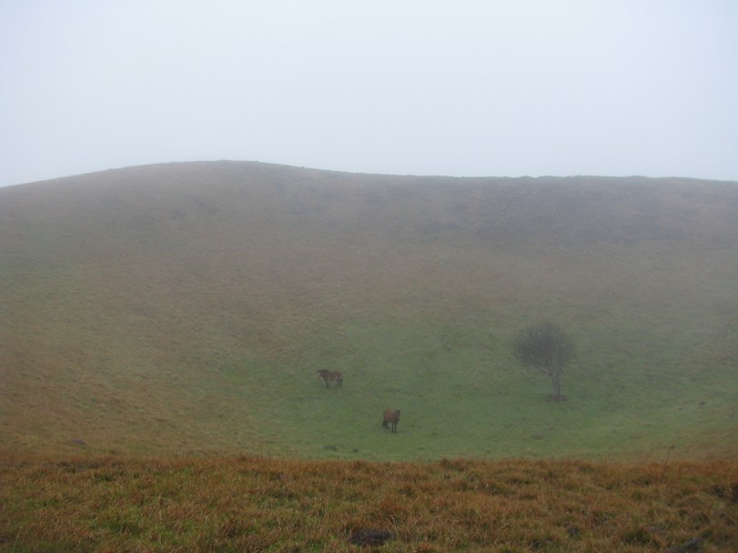 Our conversation was cut short somewhere around the 90’s grunge movement or the Mutiny on the Bounty (Pitcairn Island is Easter Island’s closest neighbor), I can’t remember, because on the top of Terevaka you literally can’t hear yourself speak. Not only have you reached the clouds, who haven’t had time to get out-of-the-way of this little speck in the ocean, you’re dealing with deafening winds from all directions. The wind is your “trust friend”, you can let yourself lean back and it’s got your back.