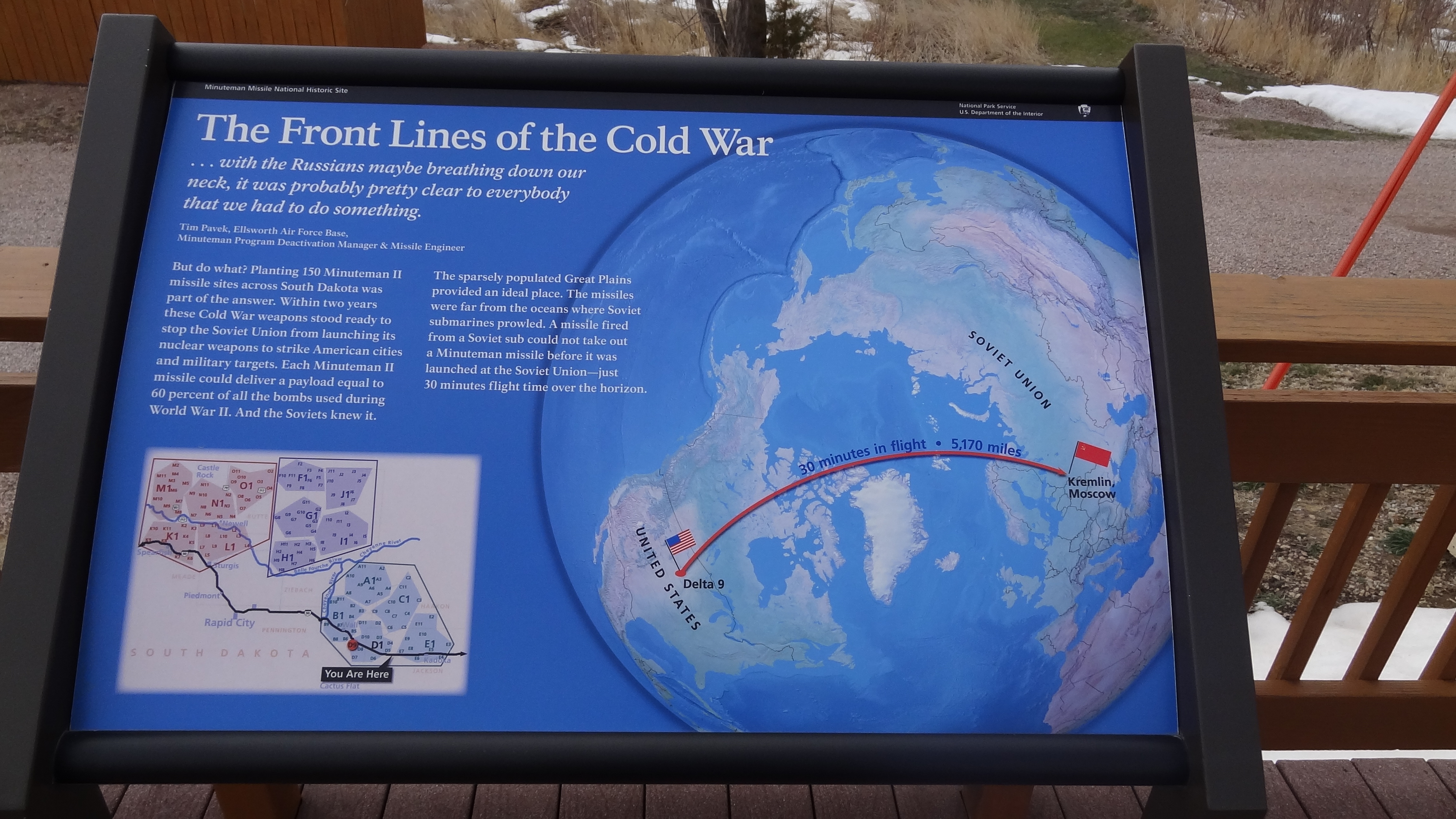 My stop at the Minuteman Missile Visitor Center was about what I expected (at least when it comes to visiting some of the “smaller” park service units, see: Paterson Great Falls NHP). Usually with these types of smaller parks, you are greeted by a NPS volunteer or non-ranger employee who has sat there most of the day just waiting for someone to walk in. Let’s just say they are ready to talk your ear off. It was no different at Minuteman, as a friendly retired Minuteman Missile operator was more than eager to speak to me about the operation. Despite my relative need to keep moving (and beat the storm coming up from Colorado into South Dakota), I happily engaged in about a 15-minute conversation with one of the friendliest guys I’ve met at an NPS site.