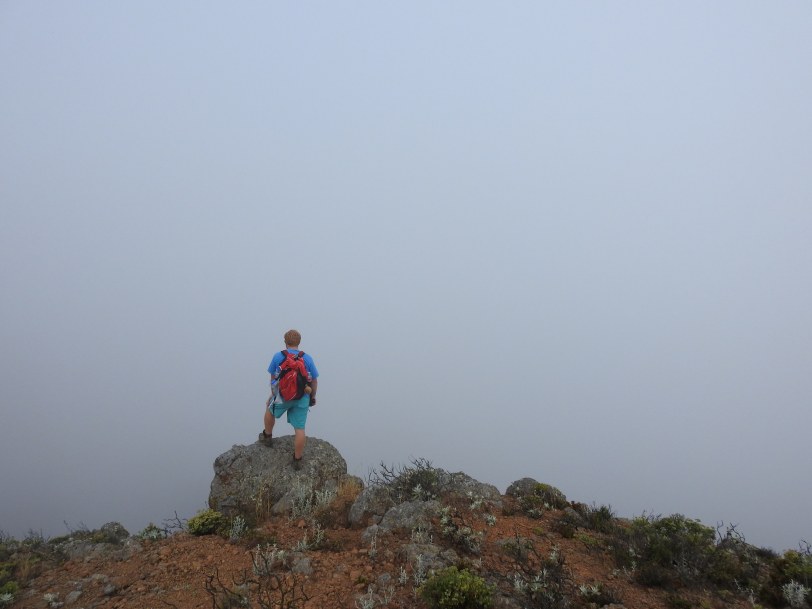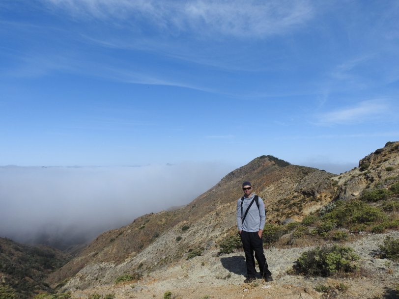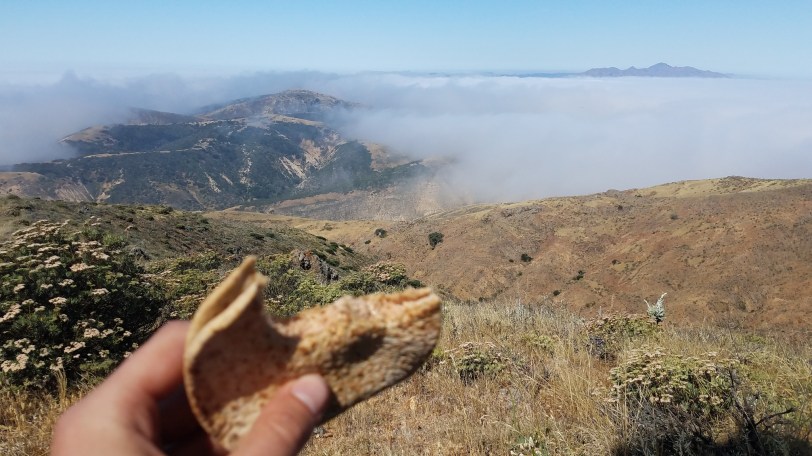 Our plan was to hike the Montanon Ridge to the high point of this part of Santa Cruz Island (the part managed by the National Park Service, and not the Nature Conservancy). This 8 mile round-trip from the campground takes you up and over the morning clouds up to a radio tower, where we stopped for a break and a early lunch (it was only around 10:30 a.m.) and took in the ever-increasing view through the cloud burnout.